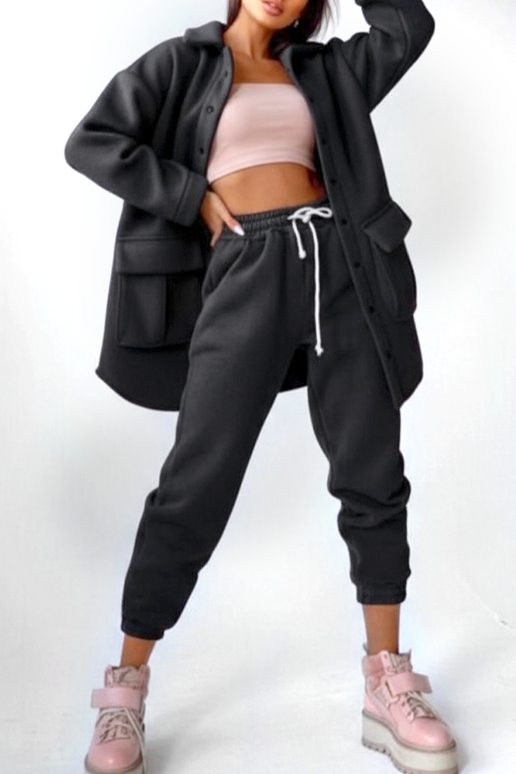- Cămașa are un design sport, nasturi și buzunare, iar pantalonii au talia înaltă și elastică.