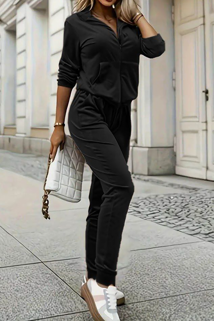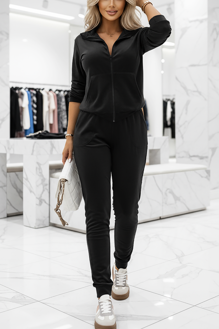 - Setul include pantaloni confortabili cu buzunare și talie înaltă și un hanorac cu glugă și fermoar.