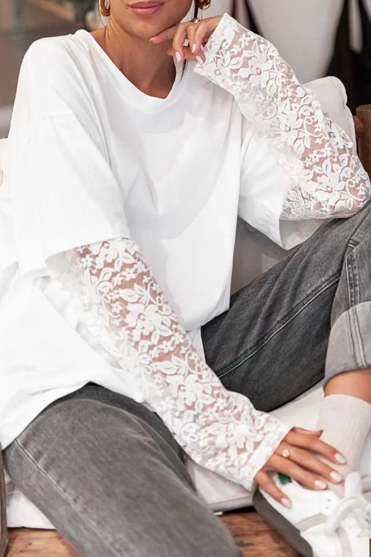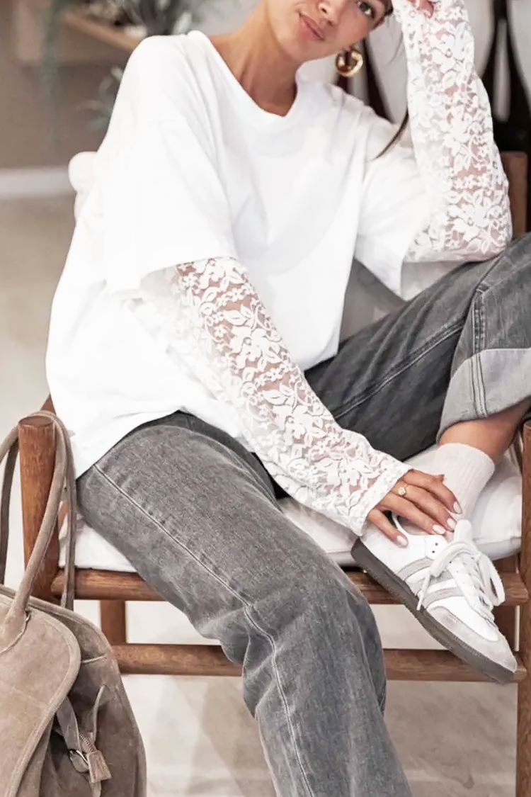 - Modelul are o croială confortabilă și un design de tip tricou, completat de mâneci lungi cu dantelă spectaculoasă.