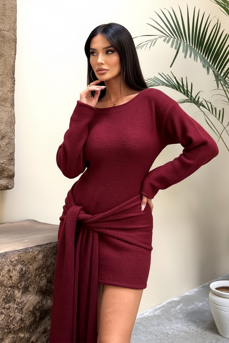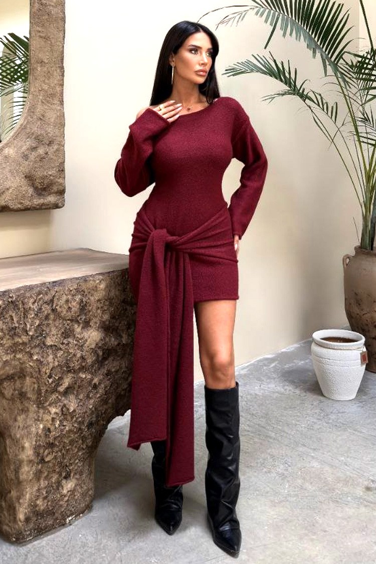 - Rochia are o croială mulată, mâneci lungi,un umăr căzut și o curea spectaculoasă din același material.
