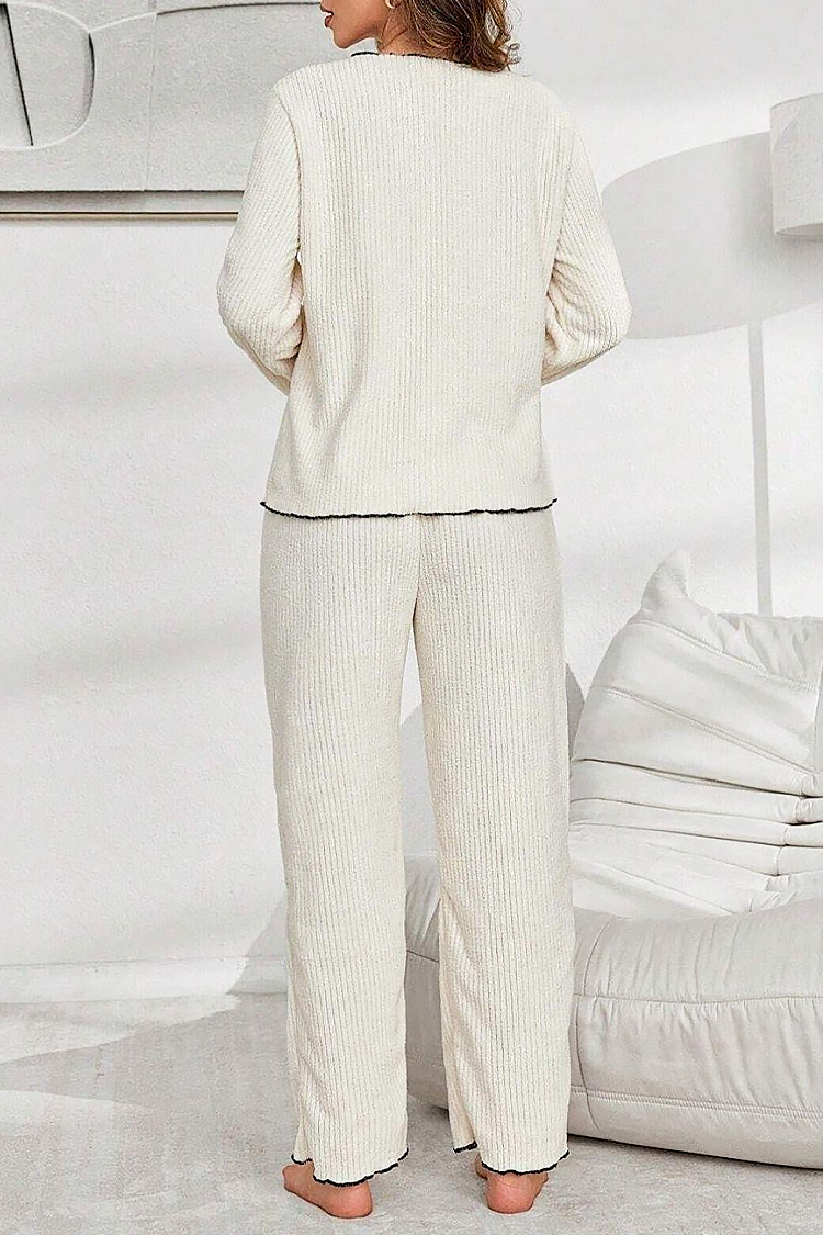 - Bluza se închide cu nasturi pe lungime, iar pantalonii au talie înaltă și o croială lejeră.