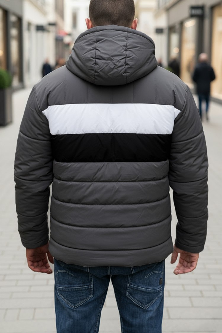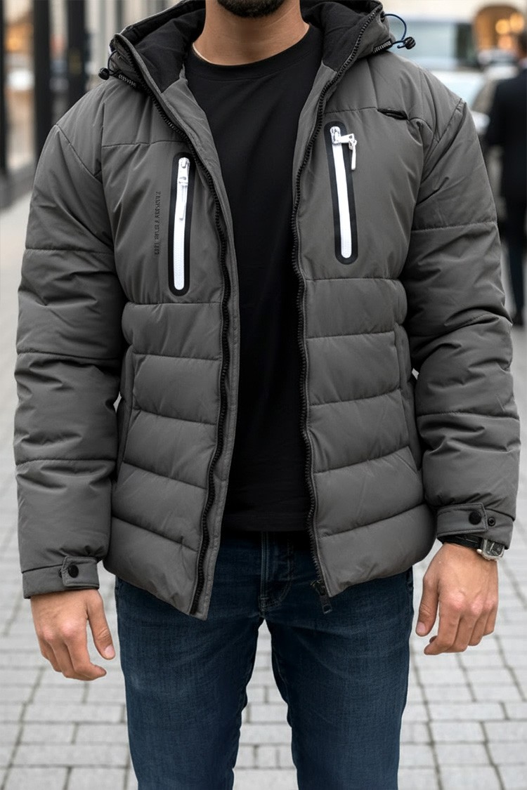 - Geacă de iarnă elegantă și modernă pentru bărbați, de gri, care combină stilul și funcționalitatea.