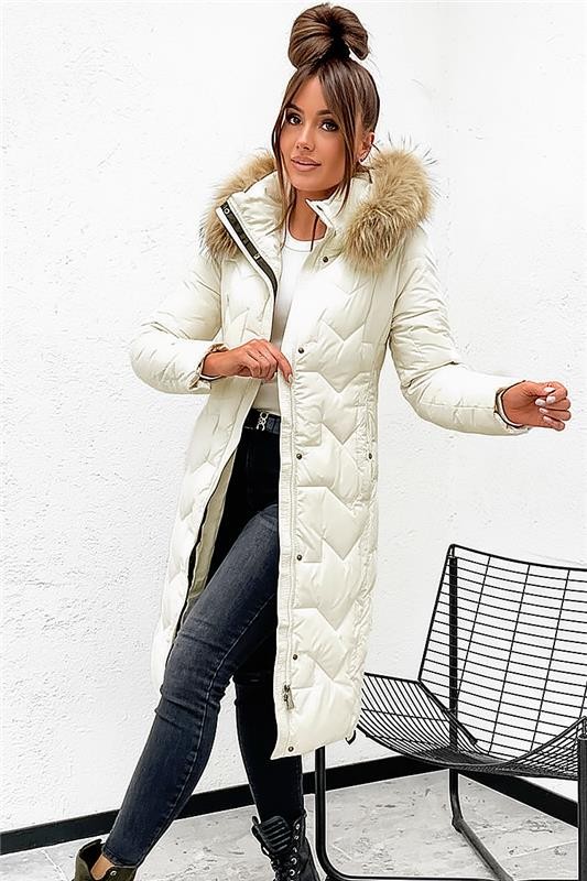 - Modelul are o croială confortabilă, buzunare practice, închidere cu fermoar dublu și nasturi și glugă cu puf.
