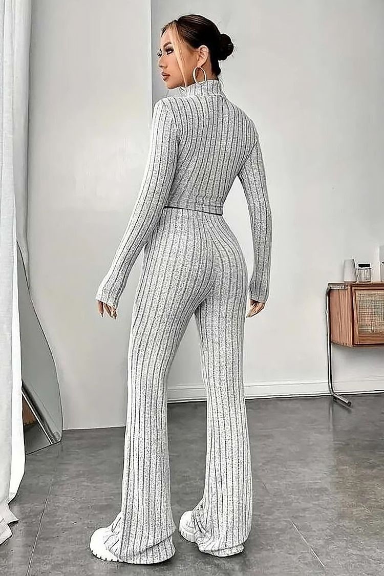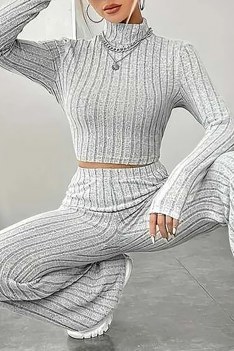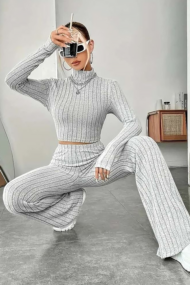 - Bluza are o croială confortabilă și o lungime scurtă, iar pantalonii au talie înaltă și picioare late.