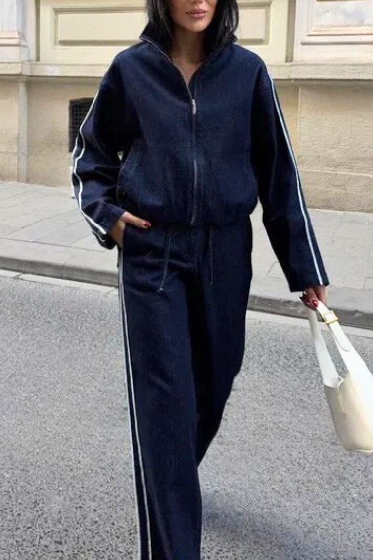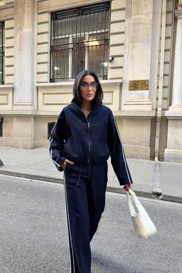 - Pantalonii au talie înaltă și o croială lejeră, iar geaca are un guler înalt spectaculos și fermoar.