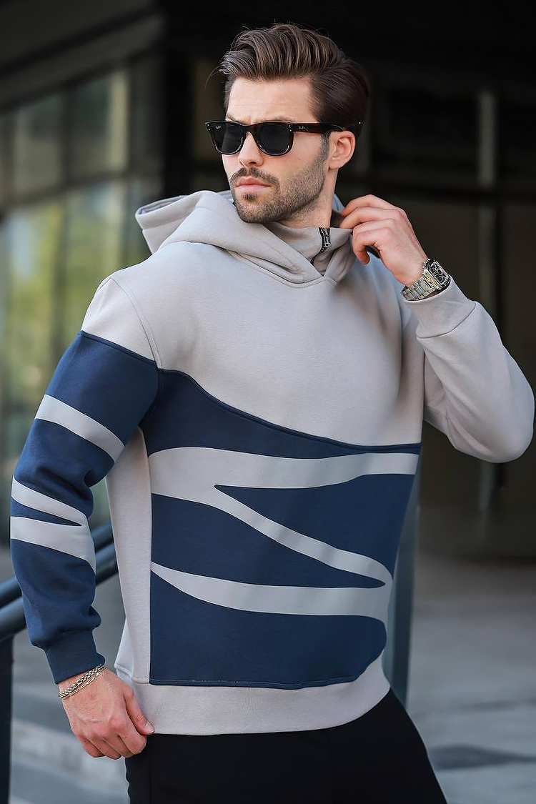 - Hanorac cu model sport-casual pentru bărbăti cu fermoar, glugă și un accent spectaculos.