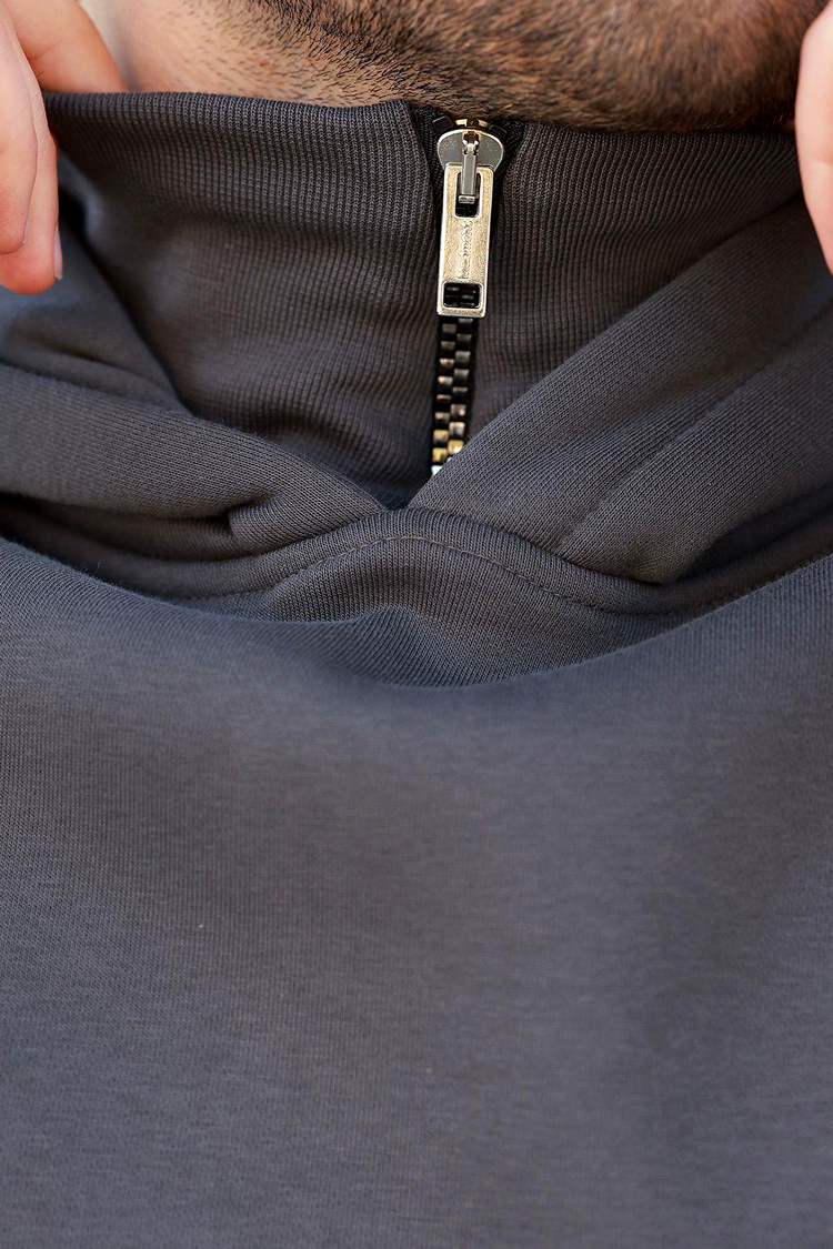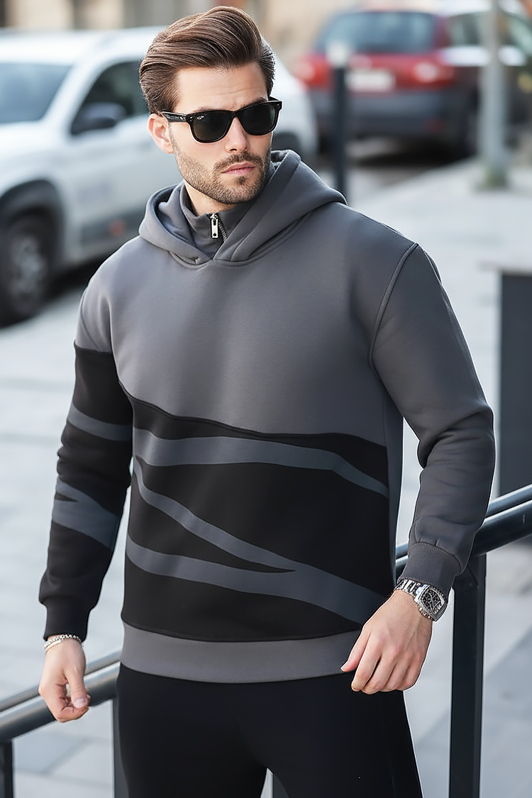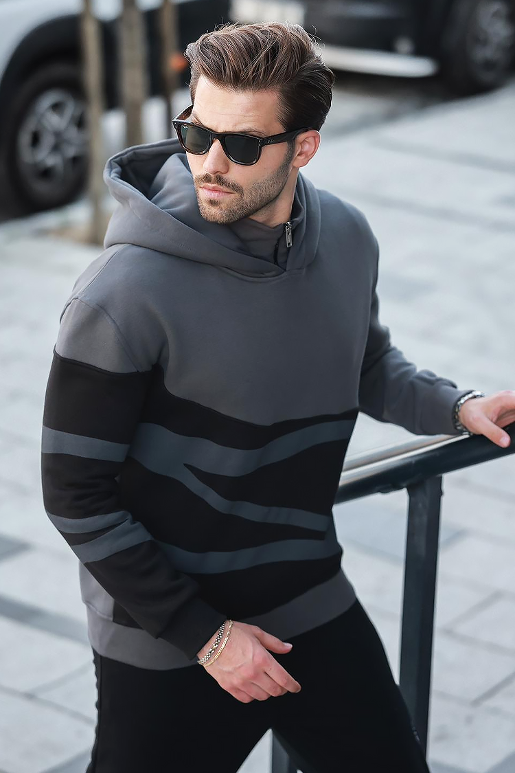 - Hanorac cu model sport-casual pentru bărbăti cu fermoar, glugă și un accent spectaculos.