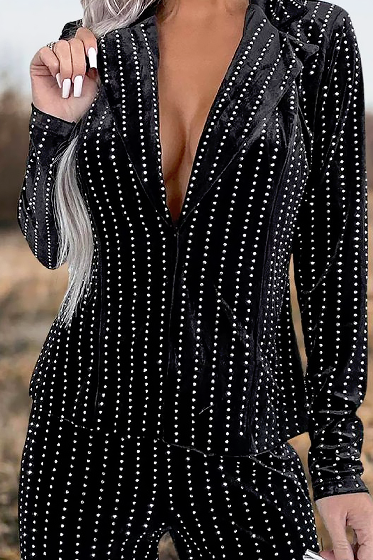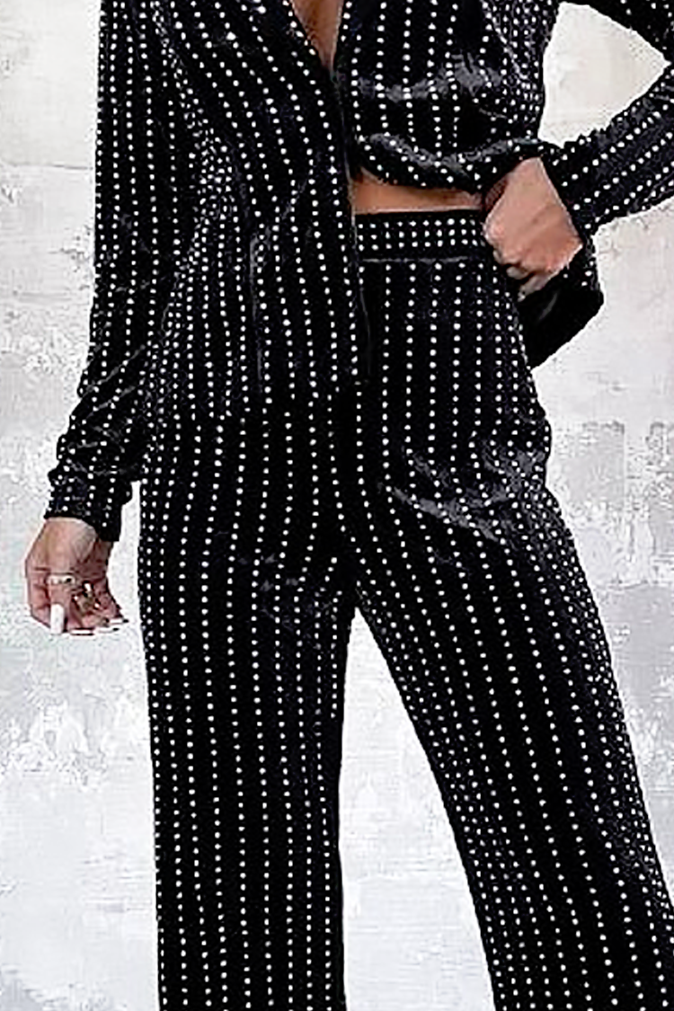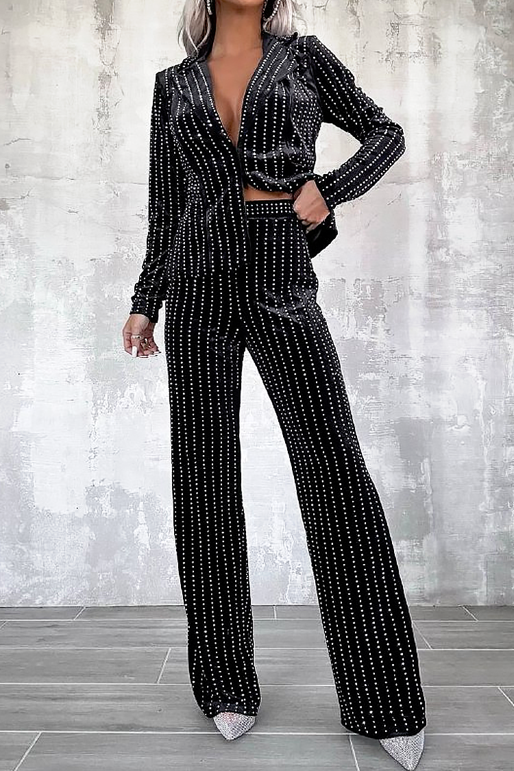 - Sacou are guler cu rever și lungime clasică, iar pantalonii au o croială evazată.
