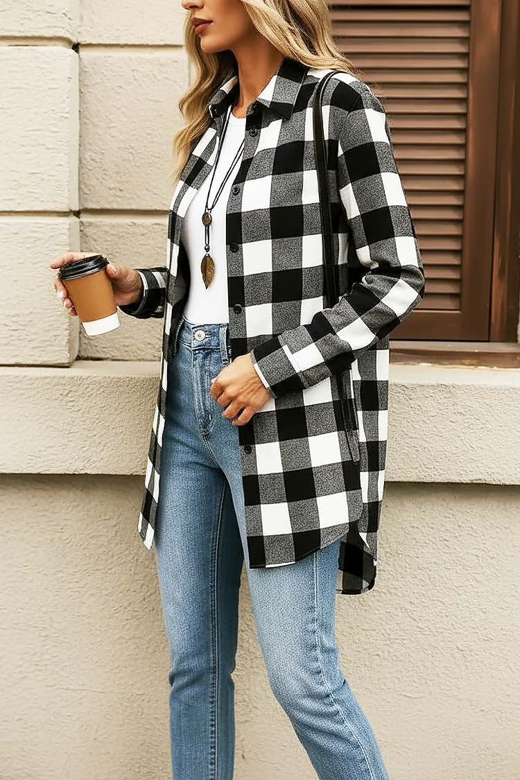 - Modelul are o croială asimetrică, un design în carouri și o închidere standard cu nasturi.