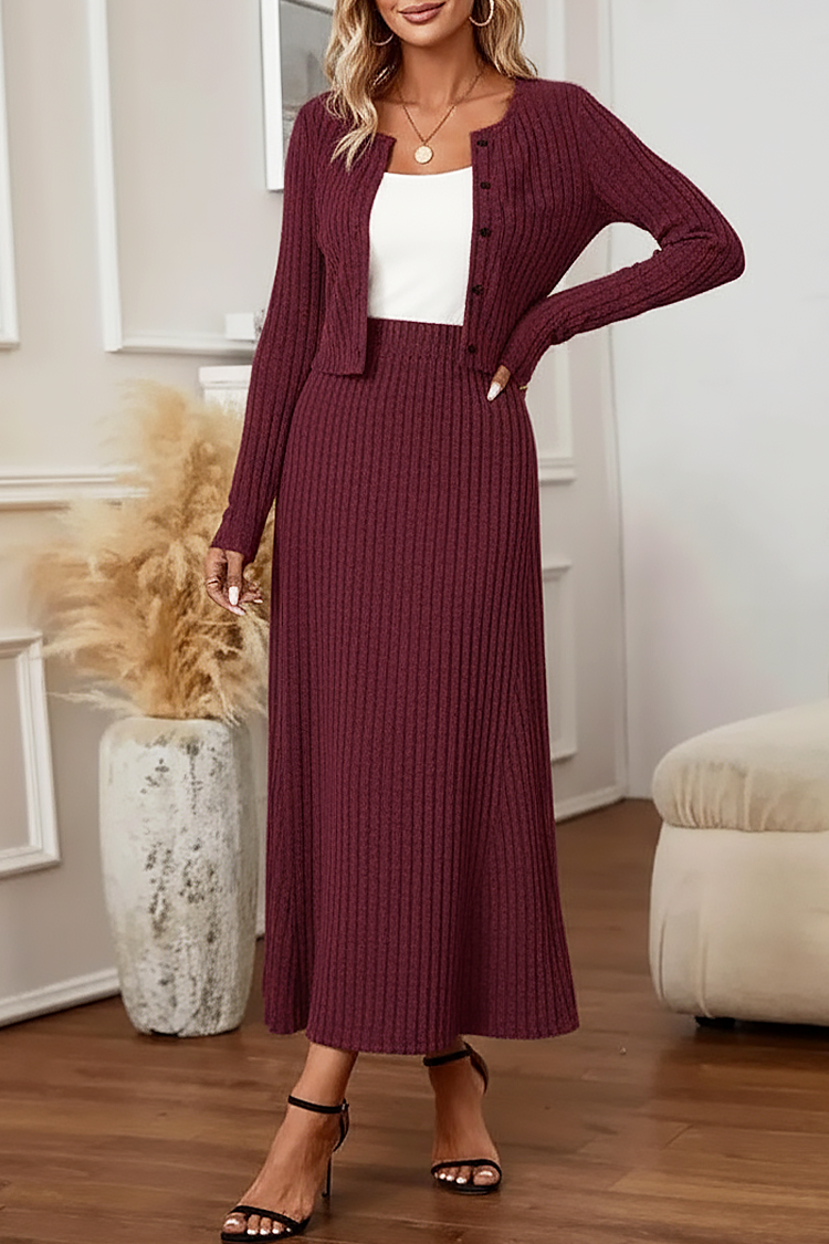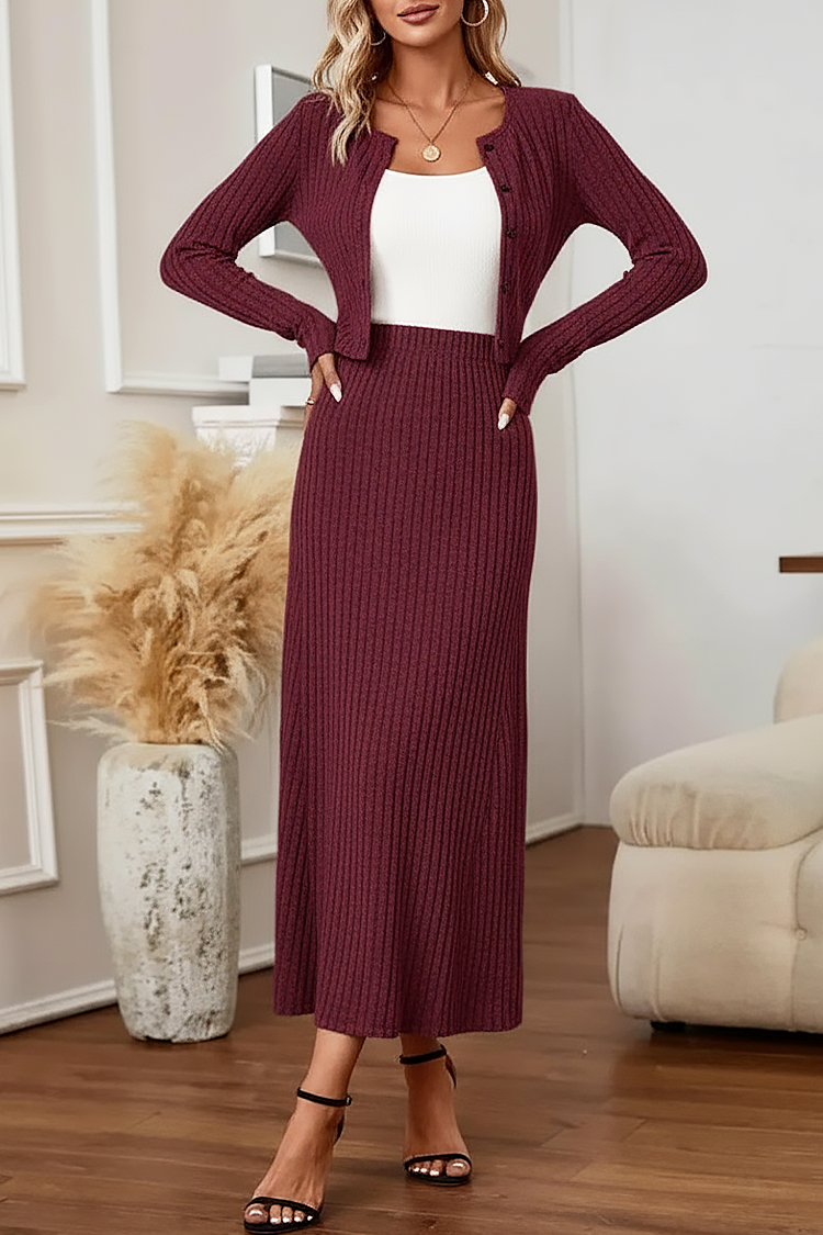 - Set modern din două piese - o fustă confortabilă și un cardigan cu un design simplu.