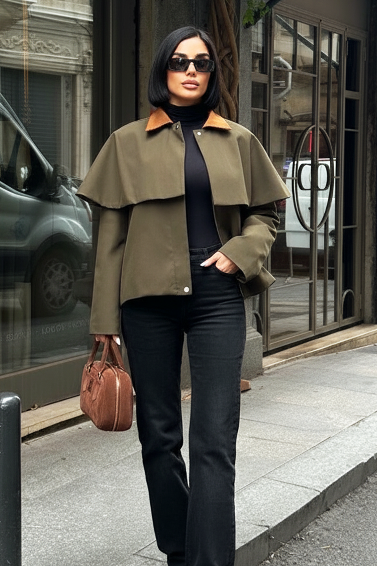 - Modelul are guler clasic, închidere cu nasturi în față și o pelerină.