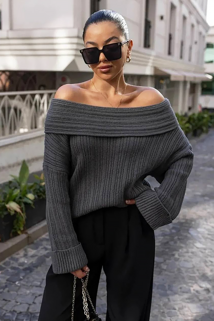 - Cu o croială lejeră care se potrivește oricărei siluete și umerii căzuți.