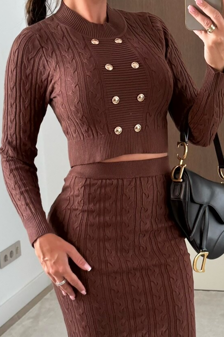- Fusta are o croială mulată și o lungime midi, iar cardiganul se închide cu nasturi la două rânduri.