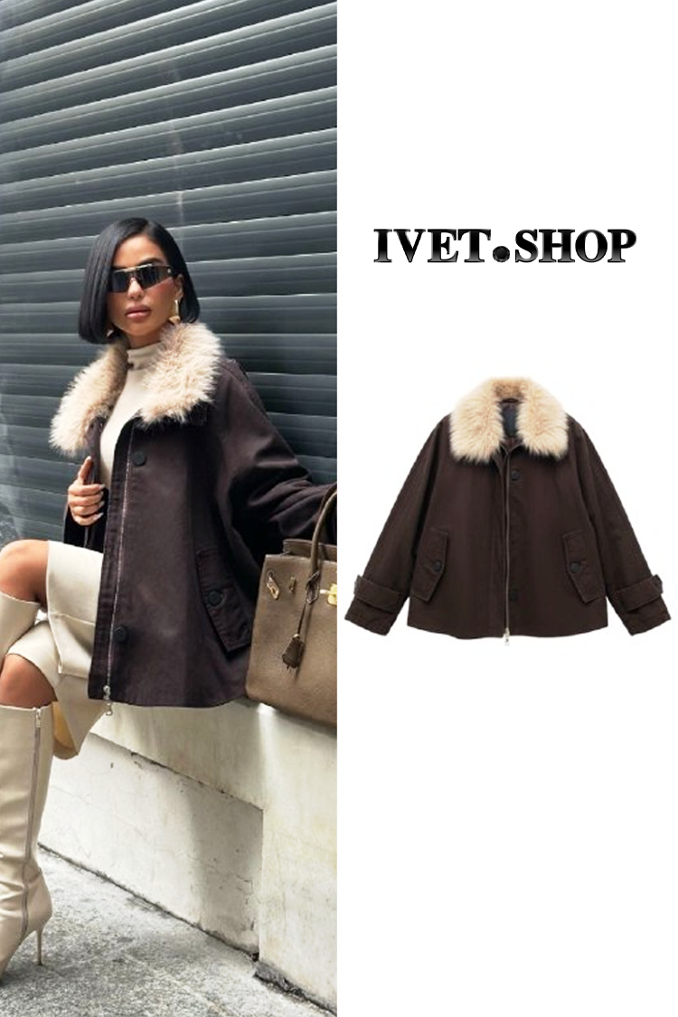- Modelul are o croială lejeră, un guler voluminos spectaculos cu puf, manșete, fermoar și buzunare.