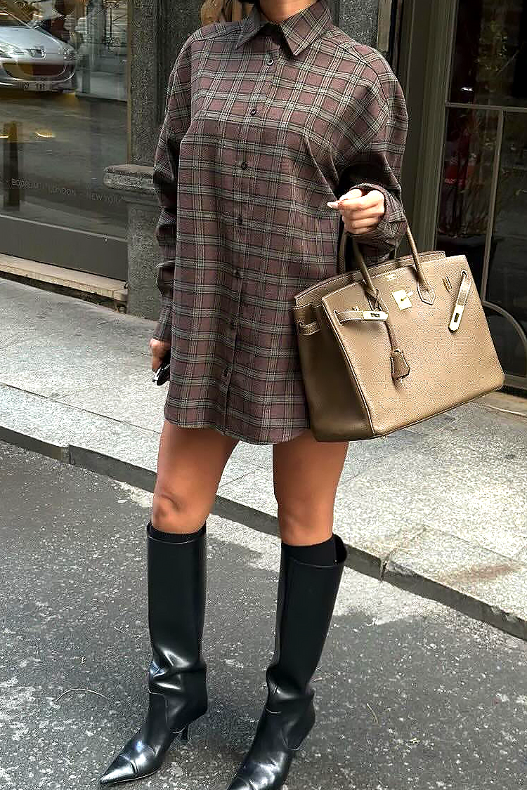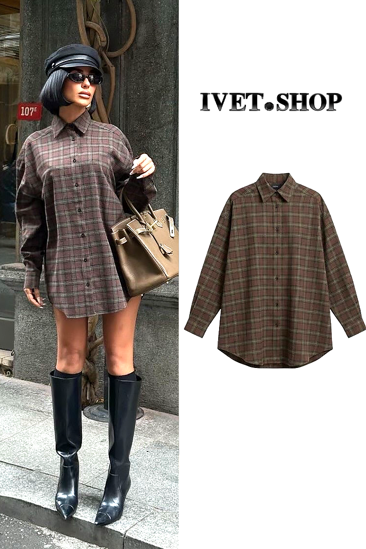 - Modelul are un design în carouri și închidere standard cu nasturi.