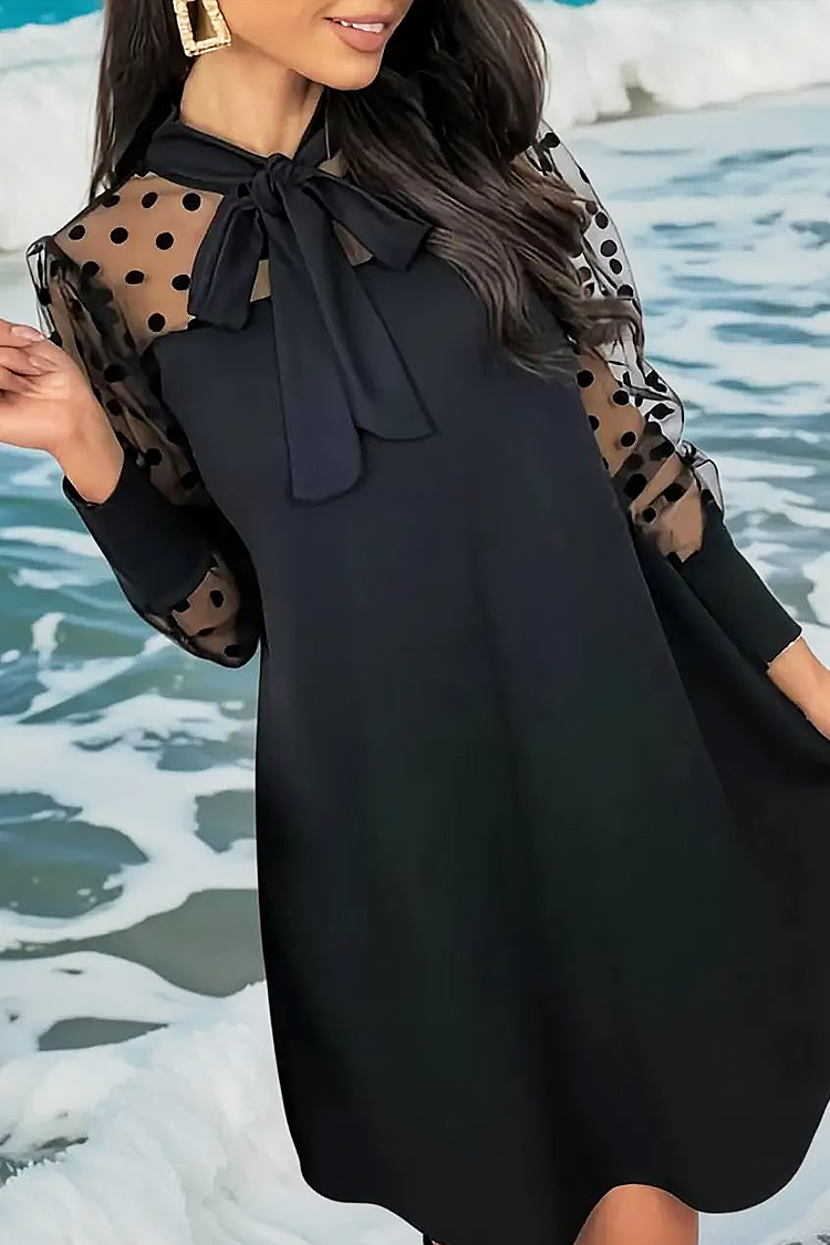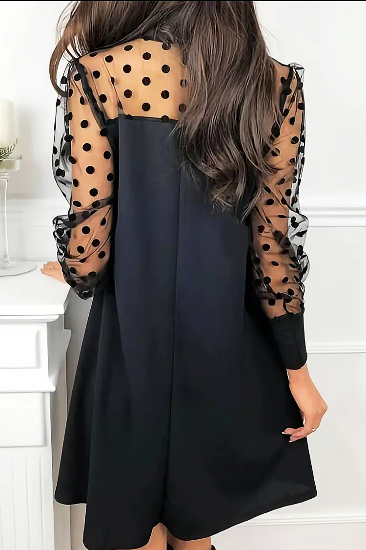 - Modelul are o croială lejeră, un guler spectaculos și mâneci din tul cu buline.