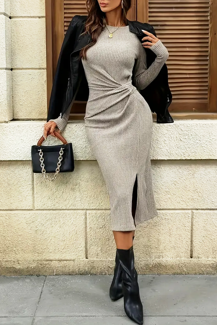 - Modelul are o croială mulată, mâneci lungi și o crăpătură sexy.