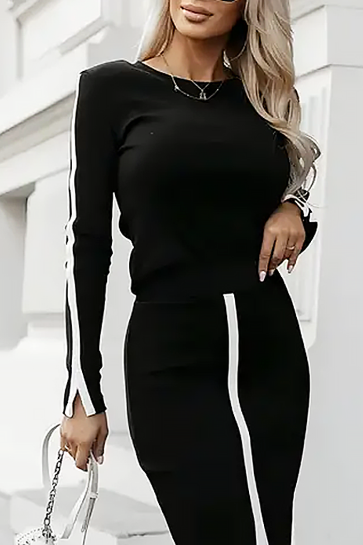 - Fusta are o croială mulată, lungime midi și o crăpătură sexy, iar bluza are un design clasic.