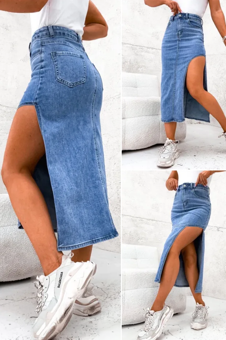 - Fustă midi din denim, elegantă și sexy, potrivită pentru ținute de zi cu zi și la modă.