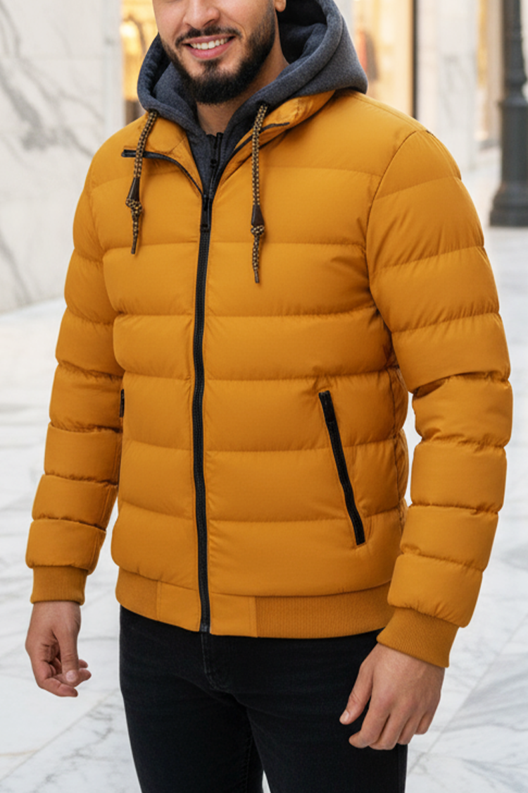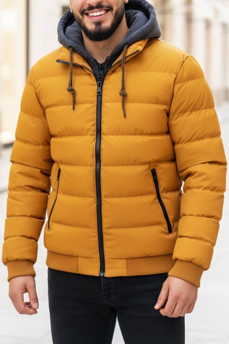- Geacă pentru bărbăti matlasată modernă, de culoare muștar, care combină confortul cu designul urban modern.
