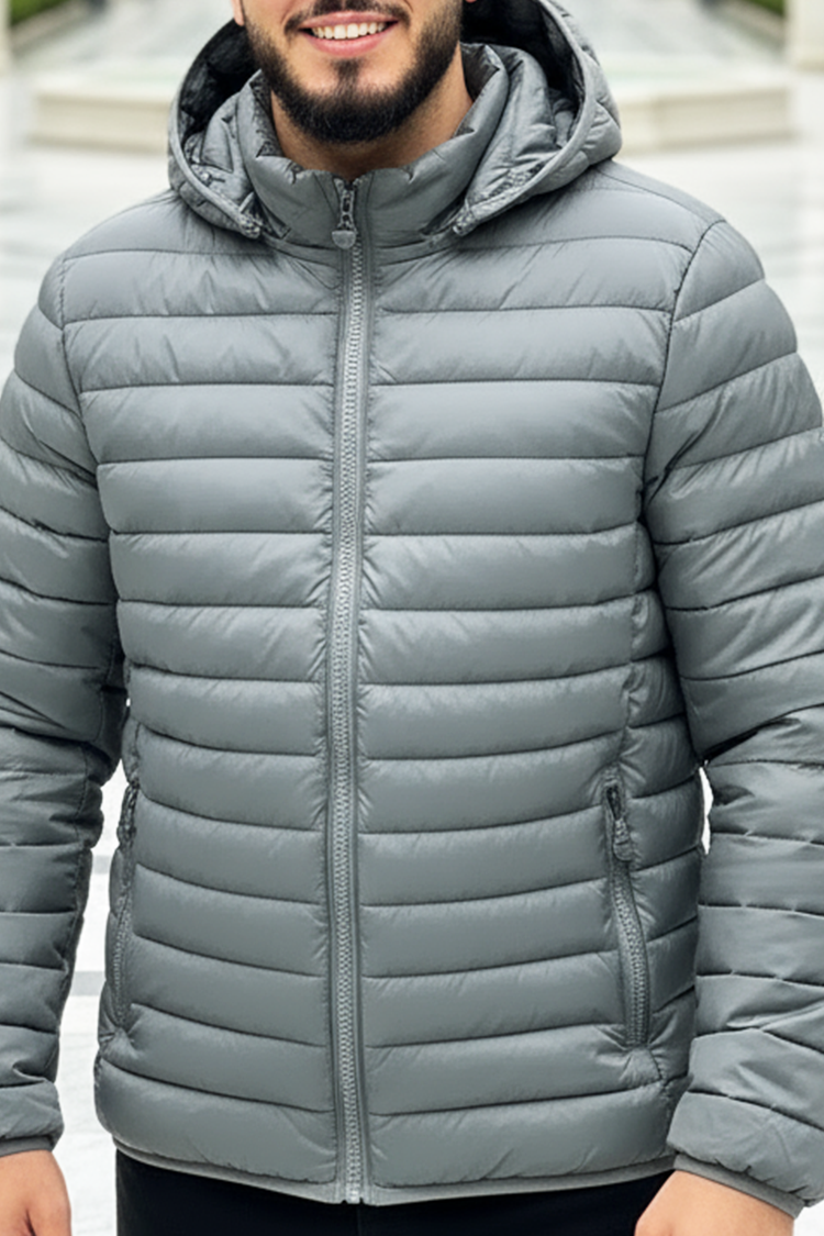 - Geacă pentru bărbăti confortabilă, cu design matlasat și glugă detașabilă, de culoare gri, cu un stil sport, de zi cu zi.