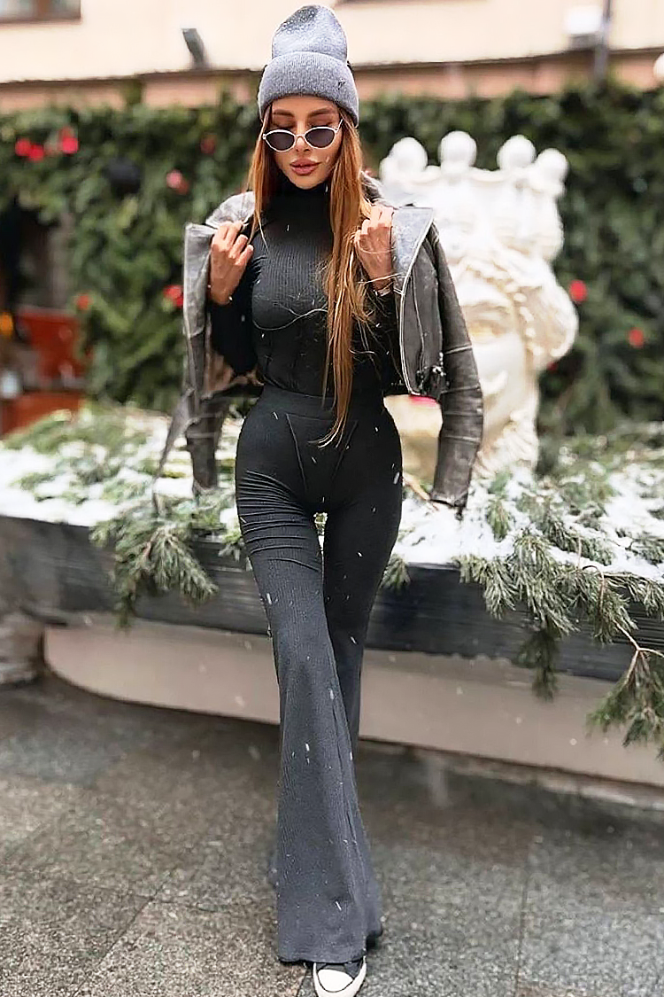 - Modelul are un body - bluză cu croială mulată și mâneci lungi, iar colanții au talie înaltă și elastică.