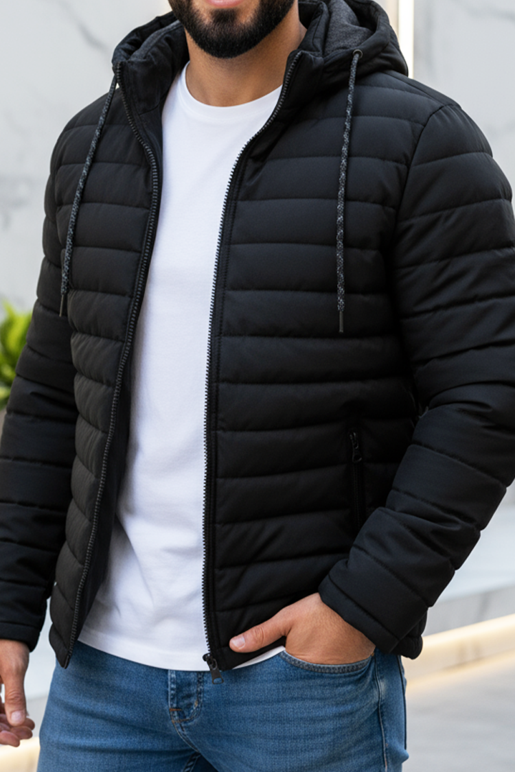 - Vă prezentăm oferta noastră specială: o geacă de iarnă pentru bărbați, cu un design modern, de culoare neagră.