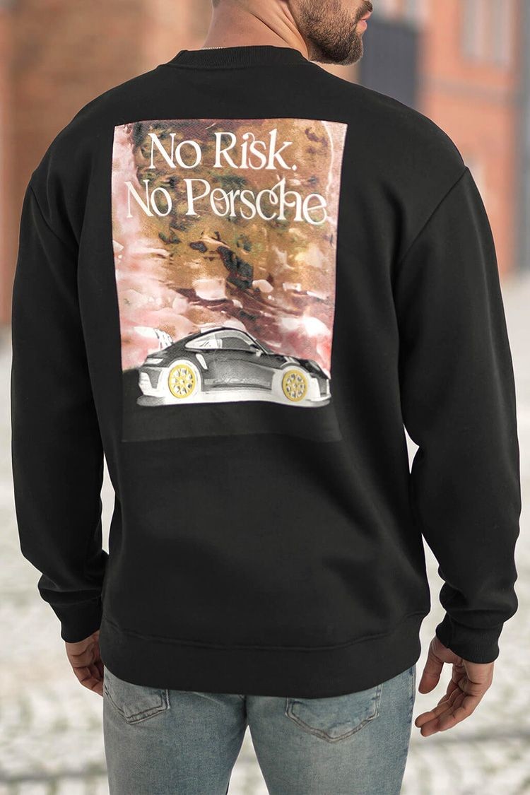 - Creează un look modern cu această bluză practică cu mânecă lungă, de culoare neagră, cu imprimeu pe spate și inscripția - no risk, no porsche.