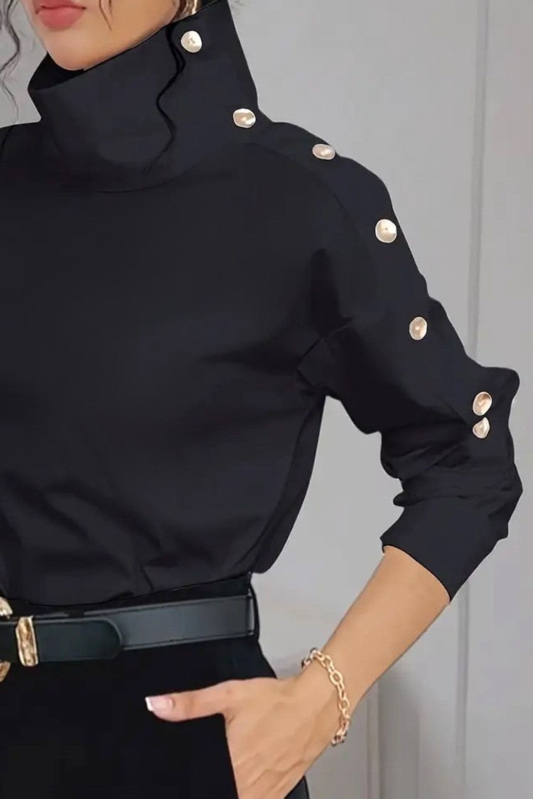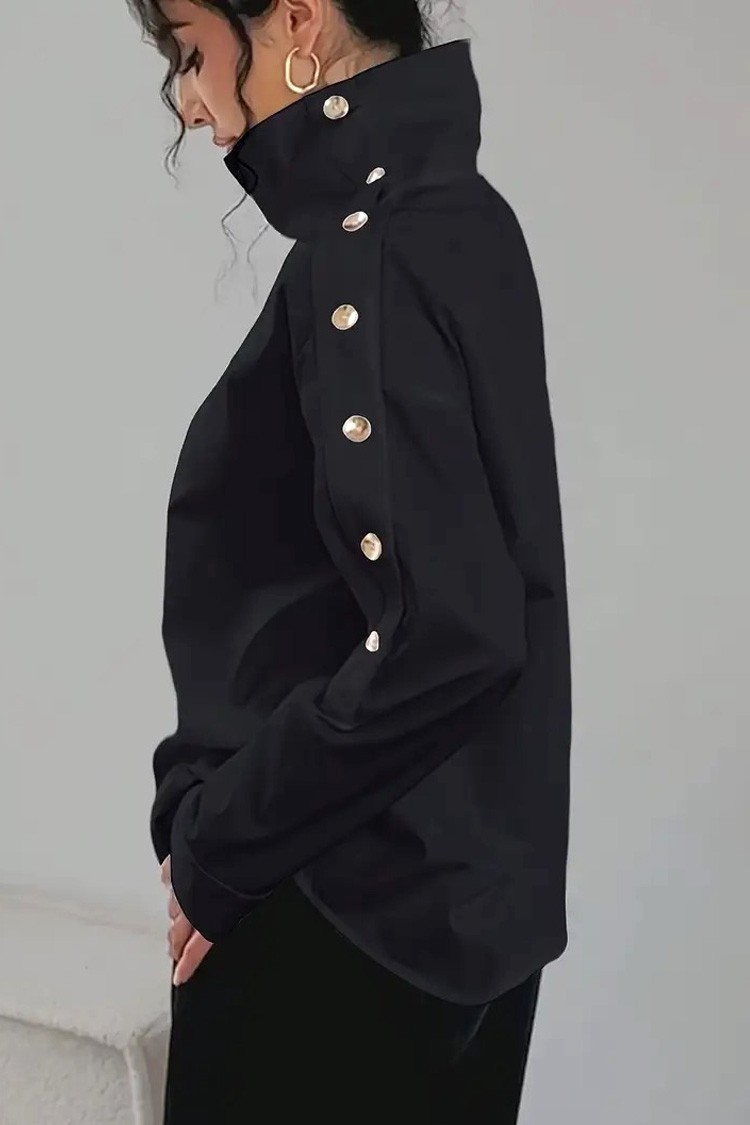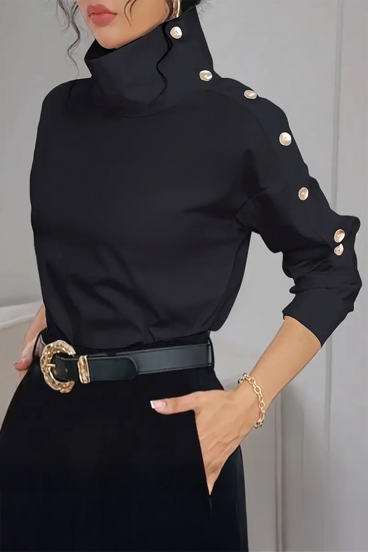 - Bluza are un guler polo elegant, nasturi aurii și poate fi purtată cu umerii căzuți.