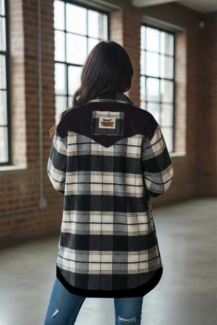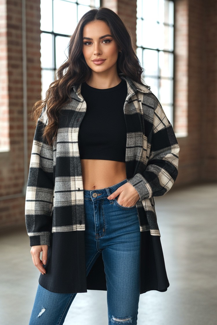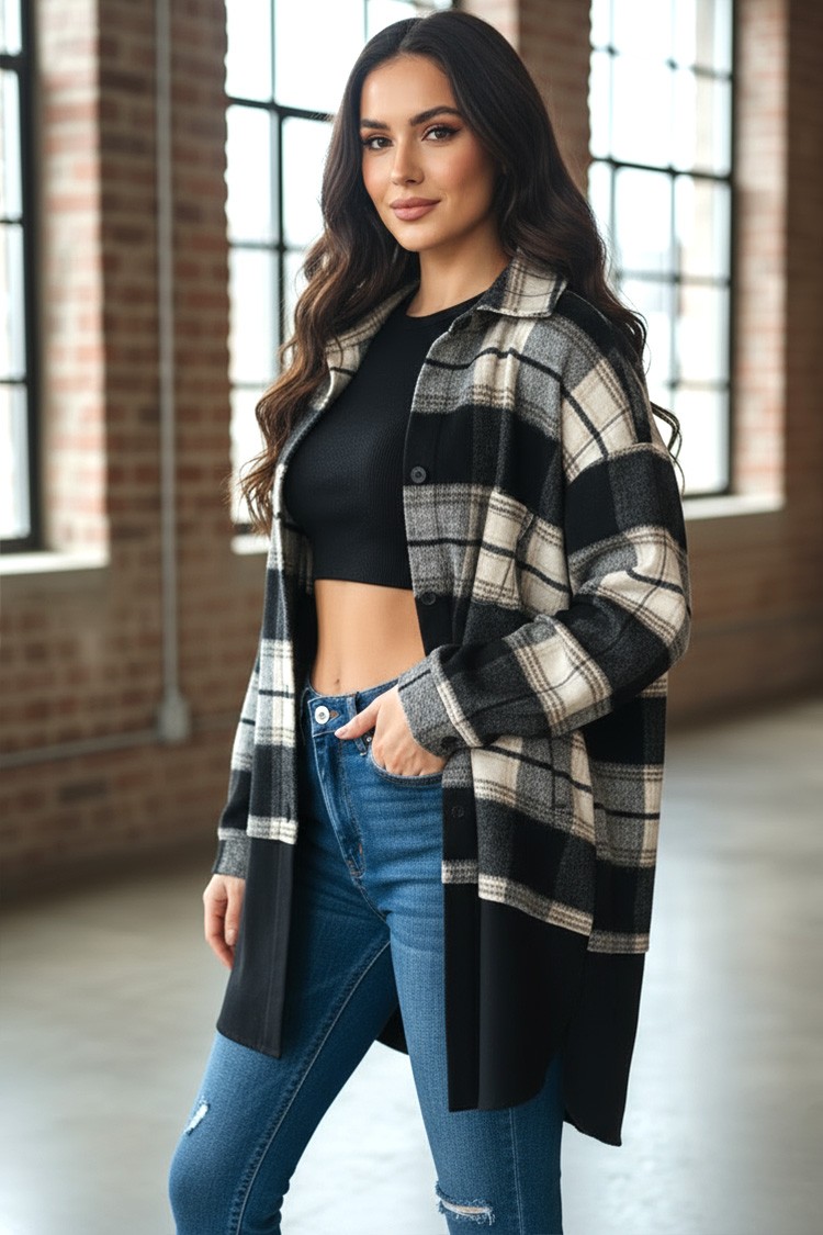 - Modelul are un design în carouri și închidere standard cu nasturi.