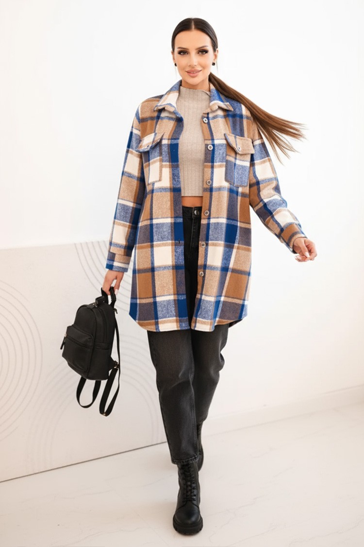 - Modelul are un design în carouri și închidere standard cu nasturi.