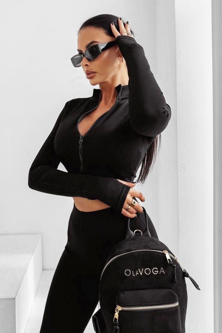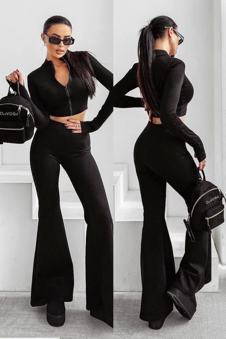 - Partea de sus este un hanorac cu croială mulată, lungime scurtă, fermoar și guler.