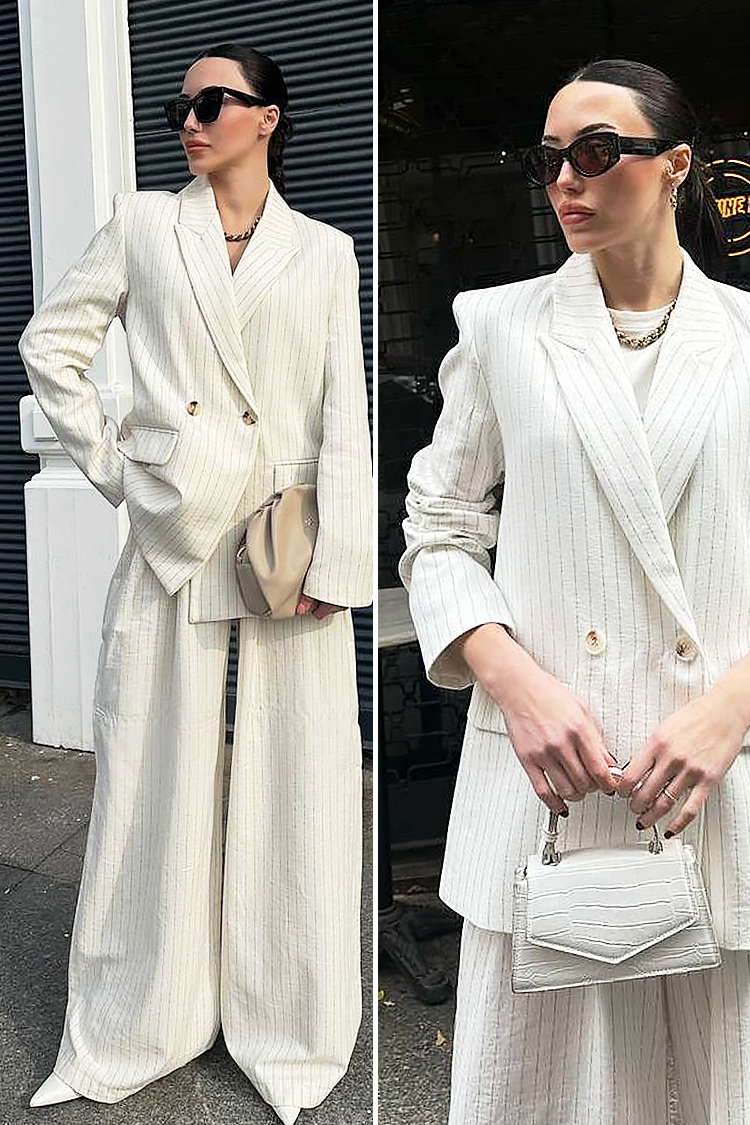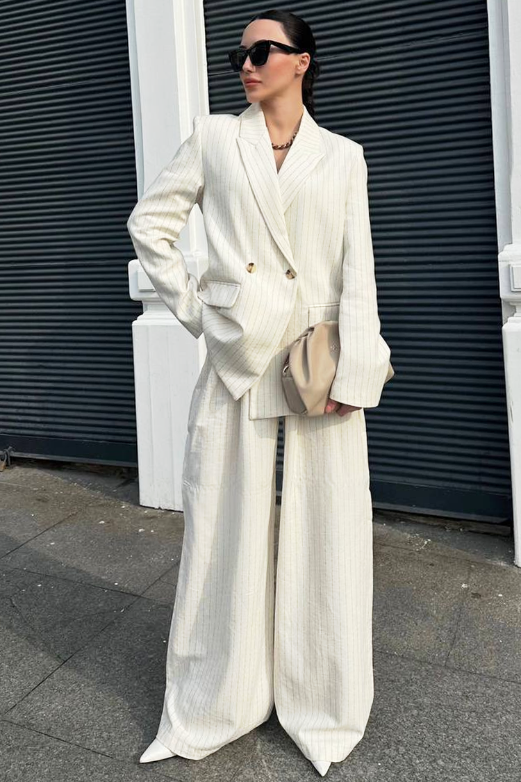 - Pantalonii au picioare drepte, iar sacou are o închidere dublă cu nasturi, guler cu rever și buzunare spectaculoase.