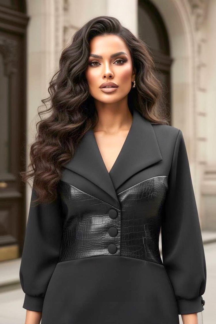 - Modelul are o croială precisă, nasturi în față și un detaliu spectaculos din piele ecologică.