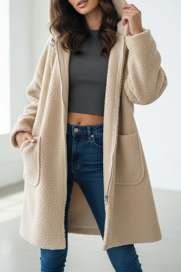 - Modelul are o croială confortabilă, glugă, buzunare mari și practice și se închide cu fermoar.
