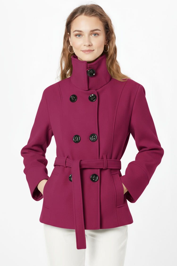 - Modelul are un guler elegant, o închidere eficientă cu nasturi și o curea din același material.