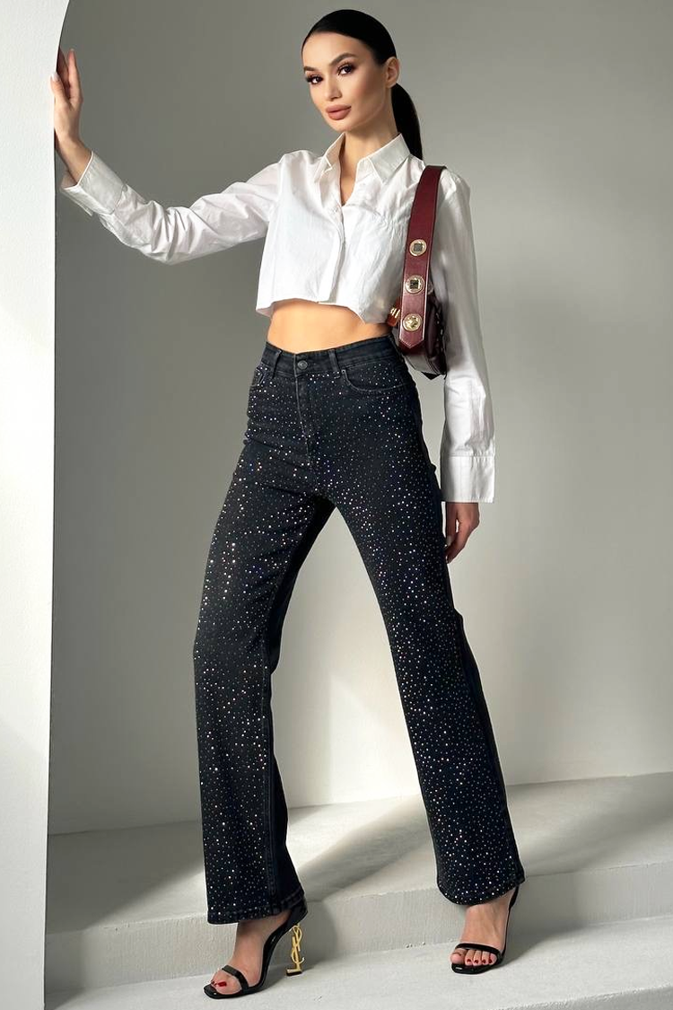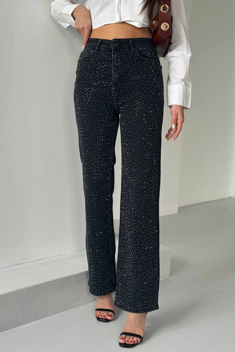 - Modelul are talie înaltă, picioare late, buzunare și detalii strălucitoare în față.
