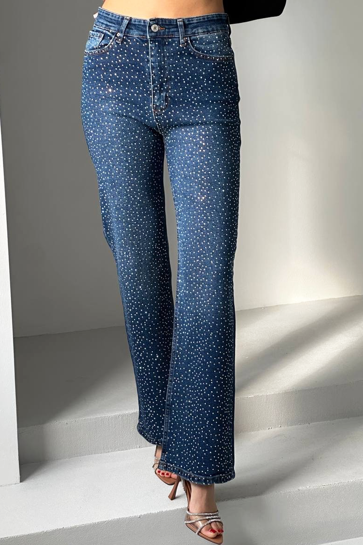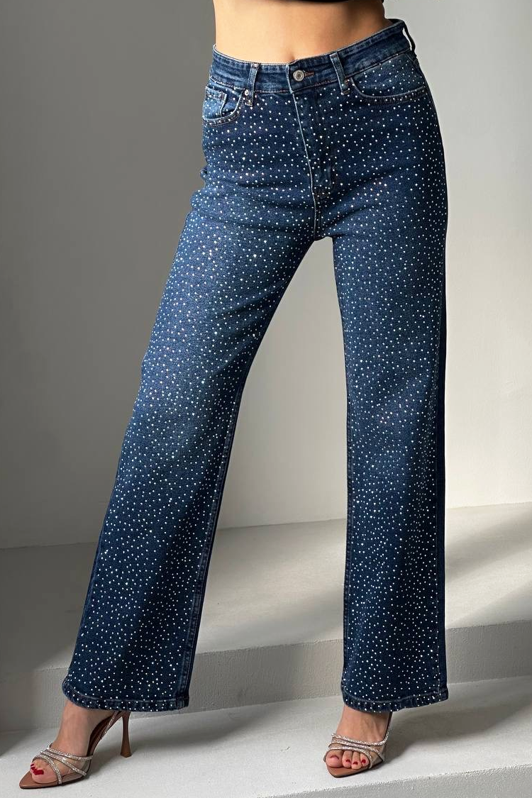 - Modelul are talie înaltă, picioare late, buzunare și detalii strălucitoare în față.