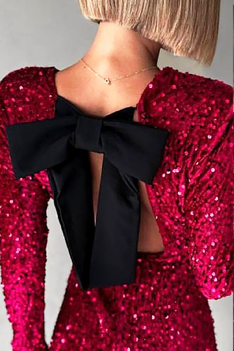 - Modelul are mâneci lungi,cu un efect strălucitor și un spate decupat decorata cu o panglică spectaculoasă pentru un aspect impresionant.
