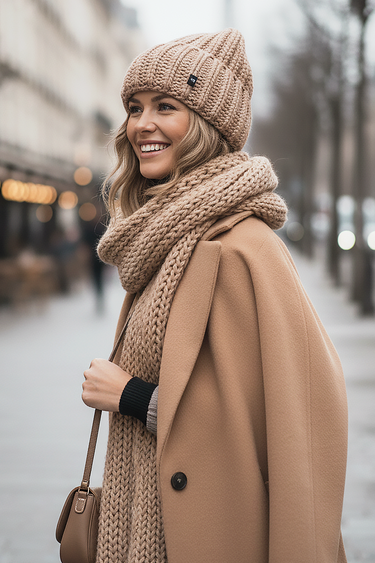 - Completează-ți ținuta cu un set din două piese - o căciulă și fular cu un model monocromatic.