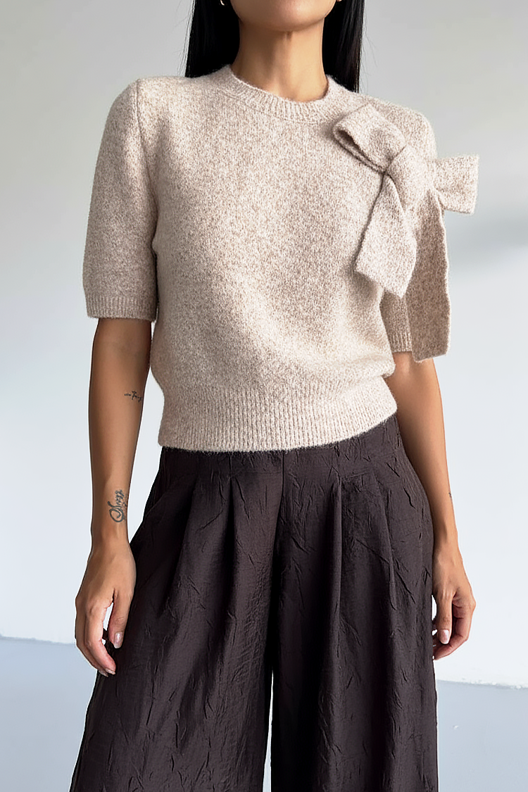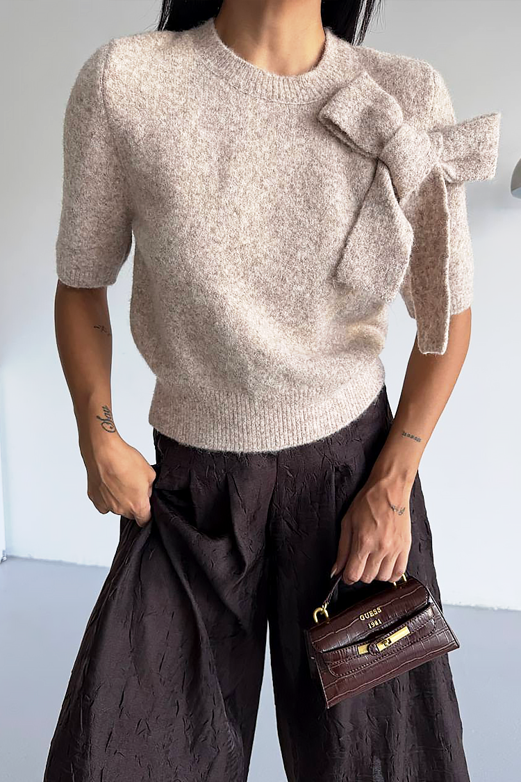 - Cu o croială lejeră potrivită pentru orice siluetă, o panglică spectaculoasă și mâneci scurte.