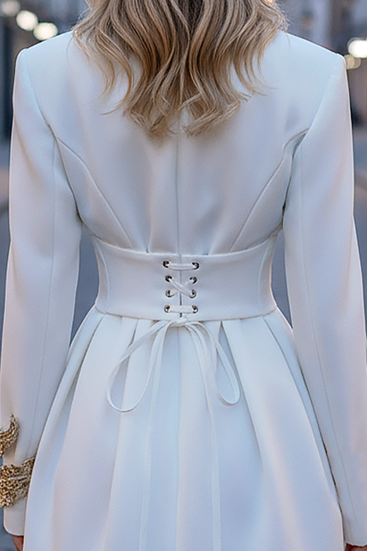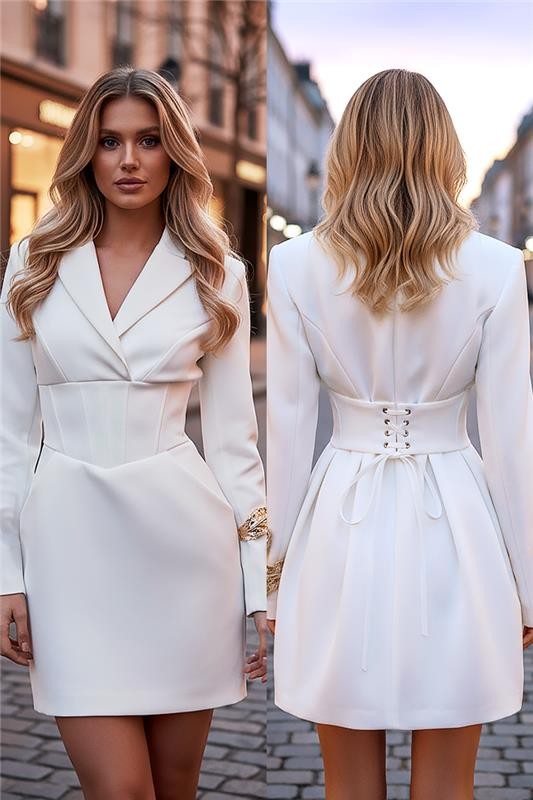 - Rochia are o croială elegantă de tip sacou, un guler stilat și este mulată în zona taliei și are legături la spate.