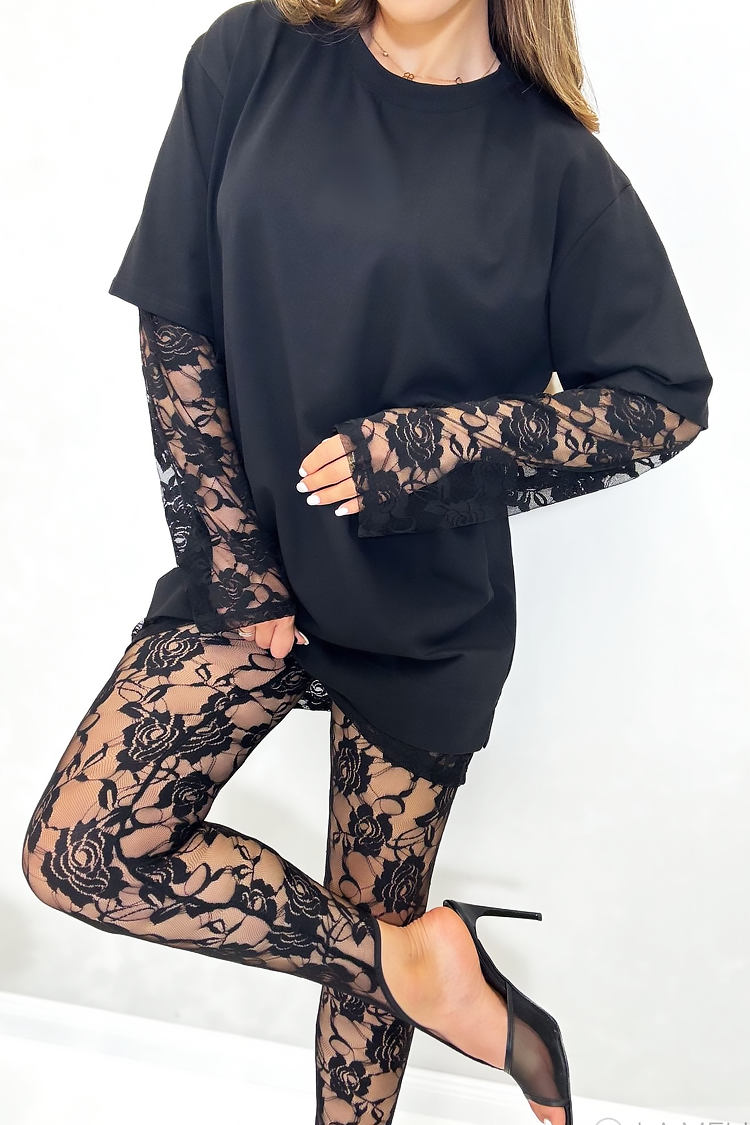 - Bluza are o croială lejeră cu un tricou cusut oversize.