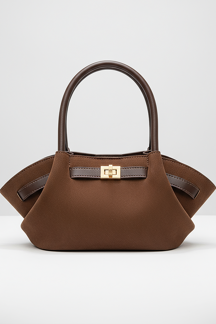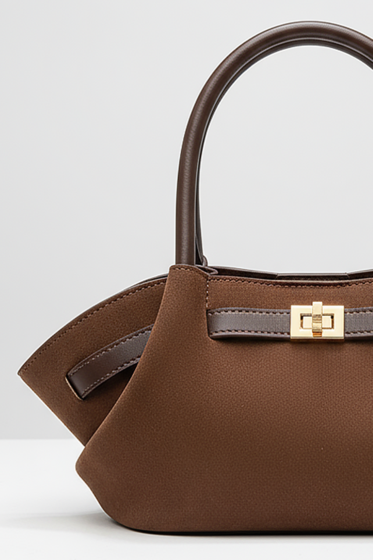 - Modelul are mânere scurte din piele ecologică și o curea spectaculoasă cu cataramă.