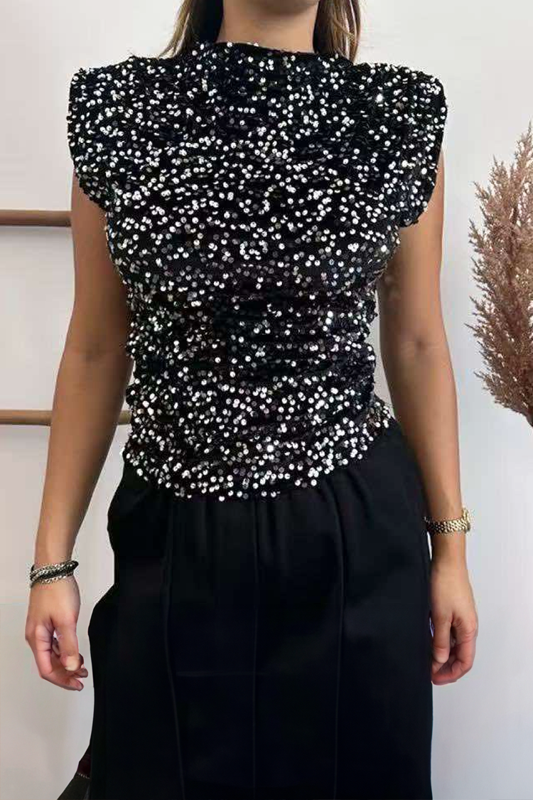 - Topul are un design spectaculos și paiete pe toată lungimea.