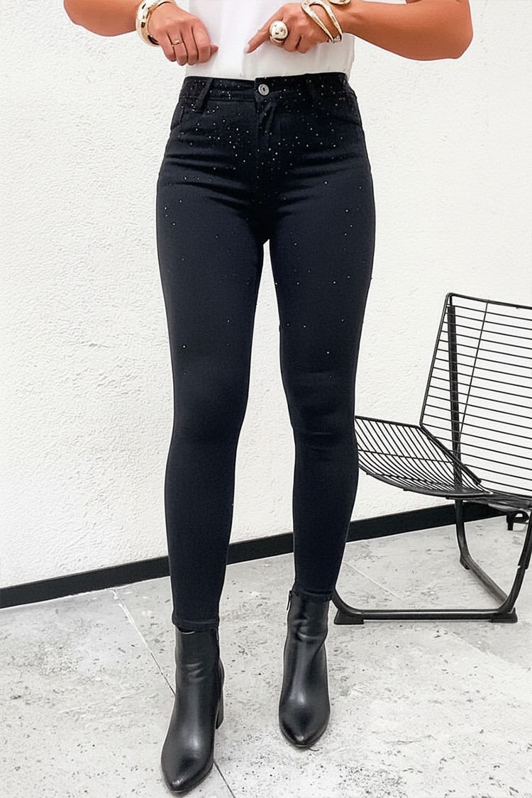 - Modelul are talie înaltă, o croială mulată și elemente decorative strălucitoare.