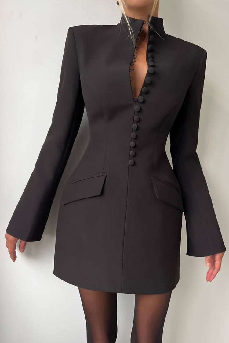 - Rochia are o croială elegantă de tip blazer, închidere cu nasturi, mâneci lungi și buzunare elegante.