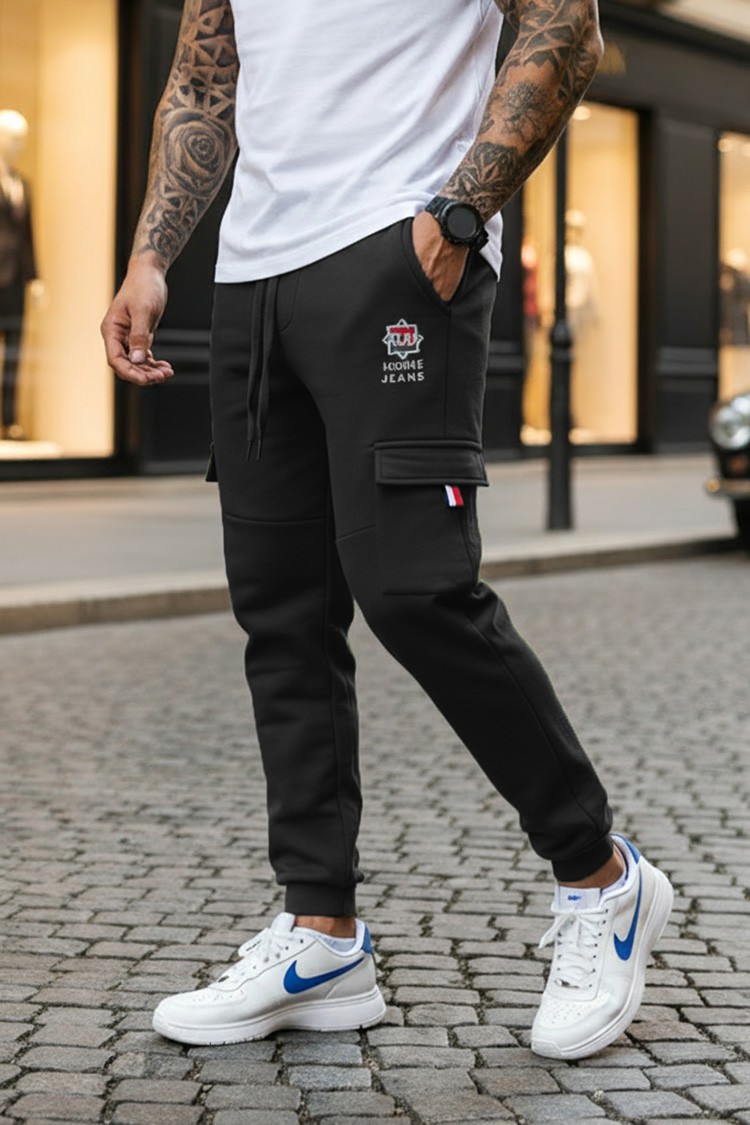 - Pantaloni pentru bărbăti de culoare neagră, potriviți pentru viața de zi cu zi sau sport.
