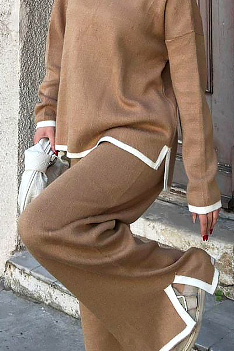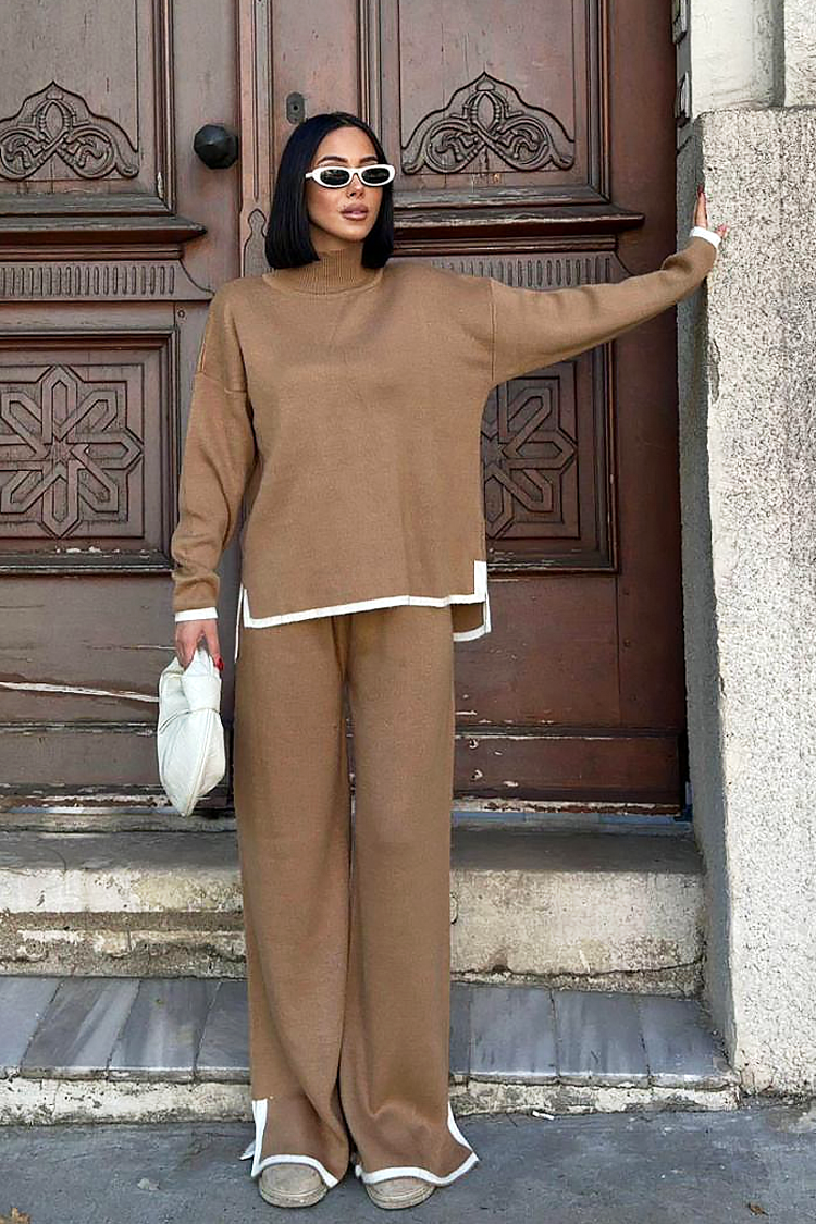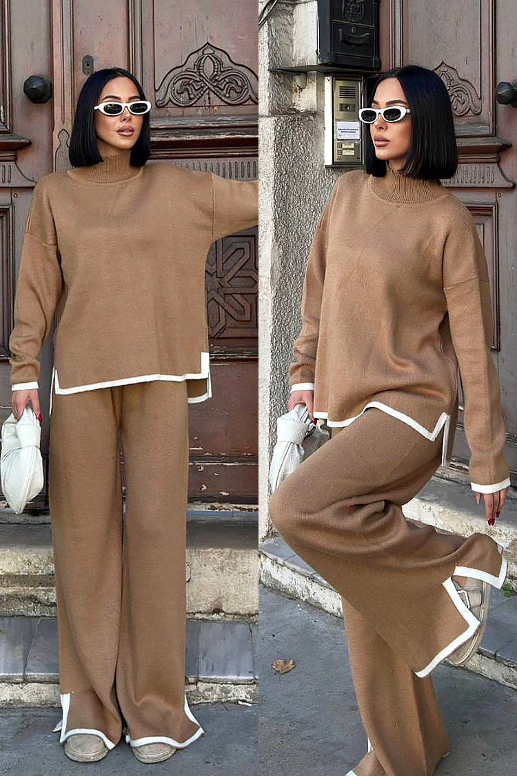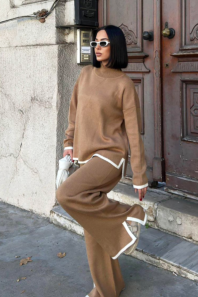 - Puloverul are o croială lejeră și guler de tip polo, iar pantalonii au talie înaltă și o croială lejeră.