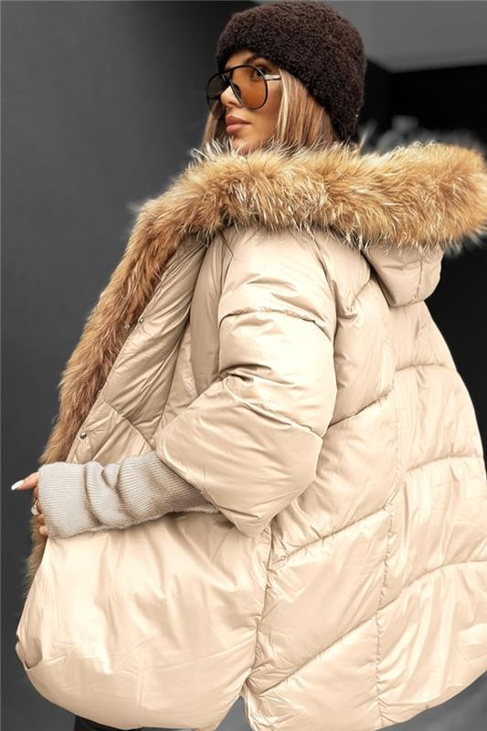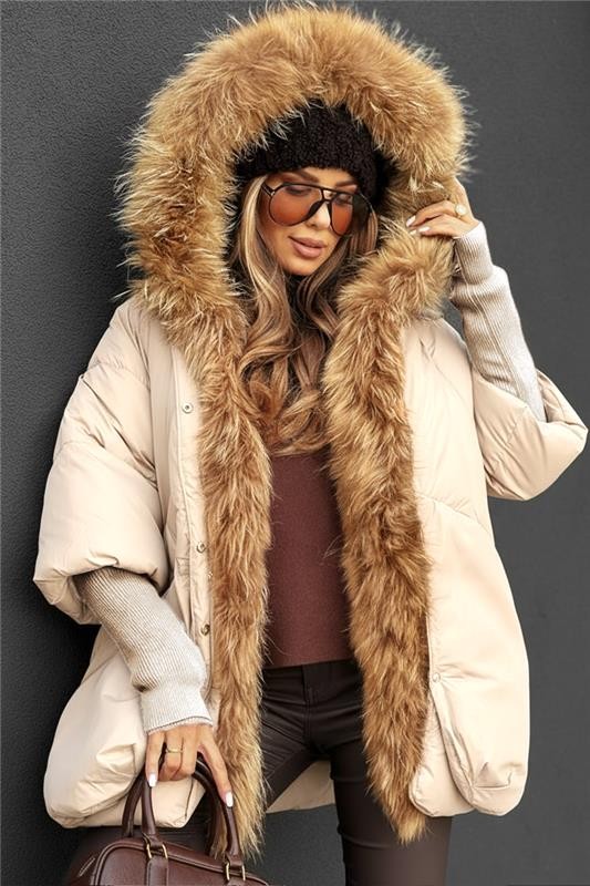 - Modelul are o croială confortabilă, închidere cu nasturi, glugă voluminoasă și puf pe toată lungimea.